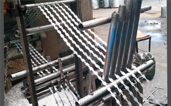 但是這種方式加工的刀片刺繩卻存在一個比較大的劣勢,那就是由于缺乏支撐所以在固定方面比較困難。采用一種可以將其固定在邊框上的方式方法就顯得尤為重要了。這時刀片刺繩采用的連接方式一般為螺絲固定,因?yàn)楸砻婊蚴清冧\或涂塑在給其進(jìn)行焊接處理時造成了很大的困難,所以才使用了這種方式進(jìn)行固定,這種成本高,主要是尺寸都是客戶訂做的,沒有統(tǒng)一標(biāo)準(zhǔn),工人做活的時候效率低,不能大批量的生產(chǎn)。